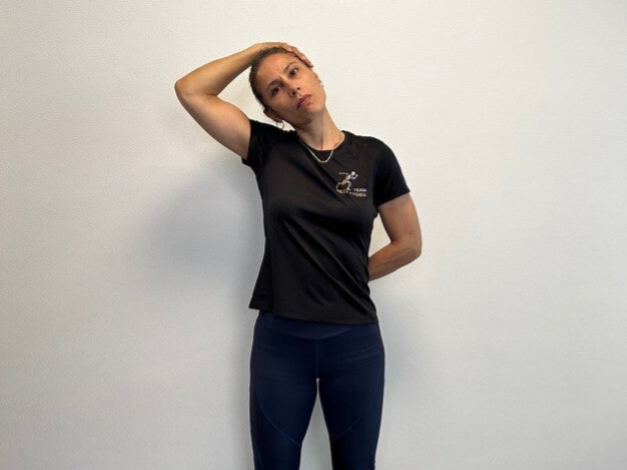 Ga rechtop staan en zet je voeten op heupbreedte. Leg vervolgens je rechterhand op je rug en leg je linkerhand lichtjes op je hoofd. Trek voorzichtig je hoofd richting je linkerschouder en kijk daarbij naar je linker oksel. Doe dit rustig en gecontroleerd. Houd deze positie 6 tot 8 seconden vast en kom dan rustig terug in de beginpositie. Daarna wissel je van kant.