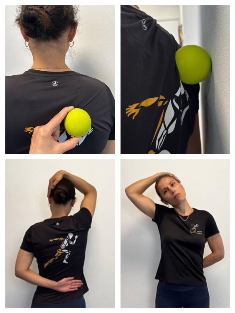 Ga op je rug liggen met de bal tussen je wervelkolom en je schouderblad. Beweeg langzaam op en neer en voel waar de pijnlijke plekken zitten. Blijf vervolgens op zo’n pijnlijke plek en beweeg rustig heen en weer om diepere spierknopen te masseren. Deze oefening kun je ook staand tegen de muur doen.